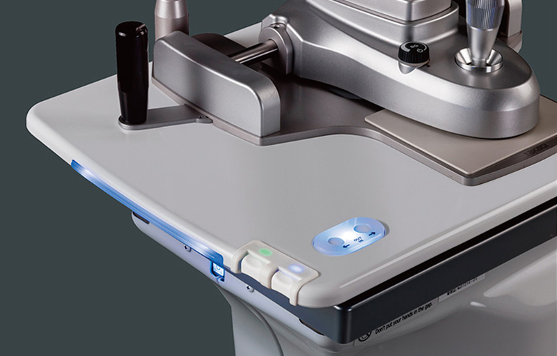 The slit lamp on the table easily moves up and down for best positioning and retracts neatly when not in use, providing complete safety and optimal inspection time.