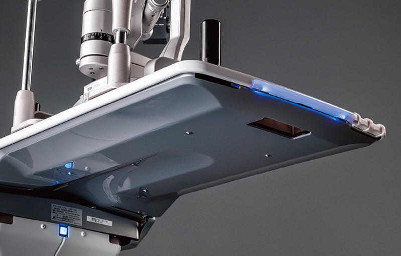 Considering the safest and most ideal conditions for using a slit lamp, it is best if the slit lamp is floating in the air and free of interference from the table. In order to get as close as possible to that state, we have developed a slide mechanism that does not attach to the table. As a result, the tabletop of this ultimate smart table is so thin that it feels like there is nothing between the patient and the user other than the slit lamp.