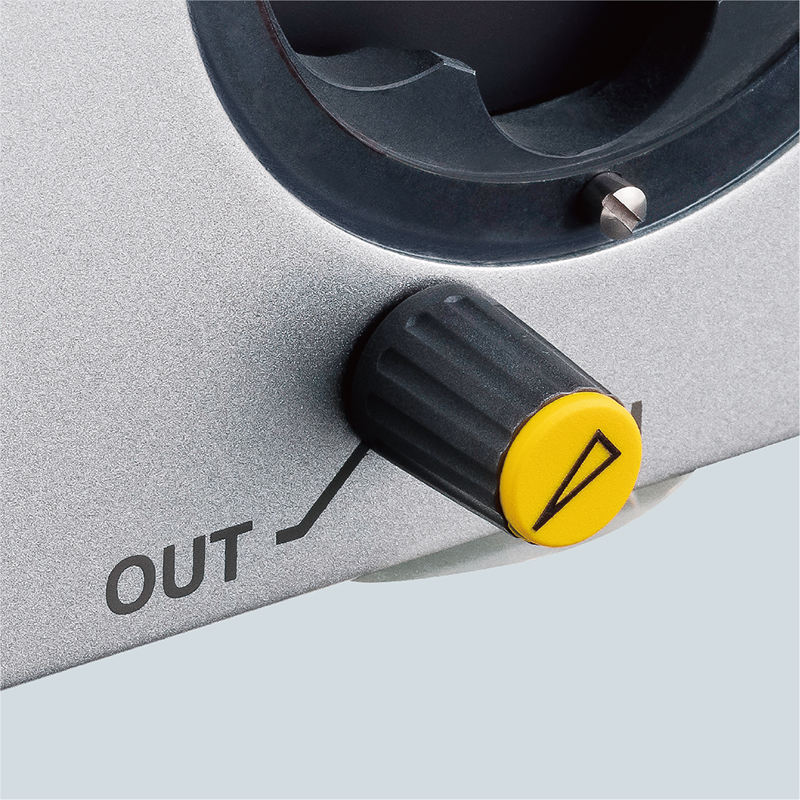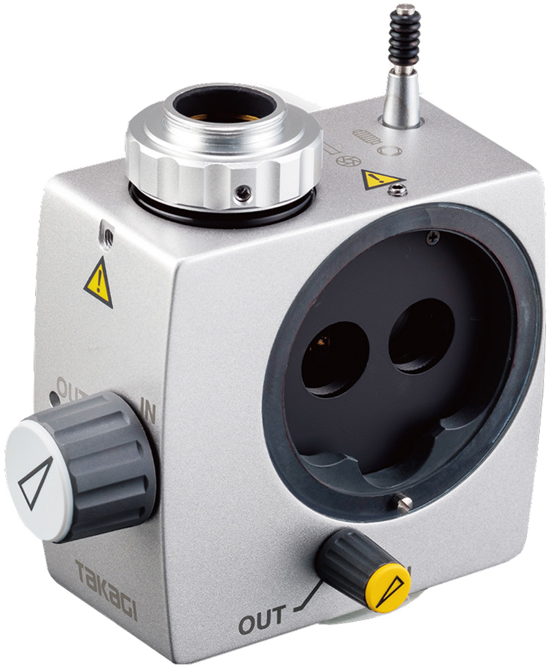 IN側にツマミを廻すと接眼からの観察と共に左眼からの画像がカメラに接続されたモニターでも見ることができます。OUT側では接眼レンズからのみの観察となり、モニターでは映像を見ることができません。