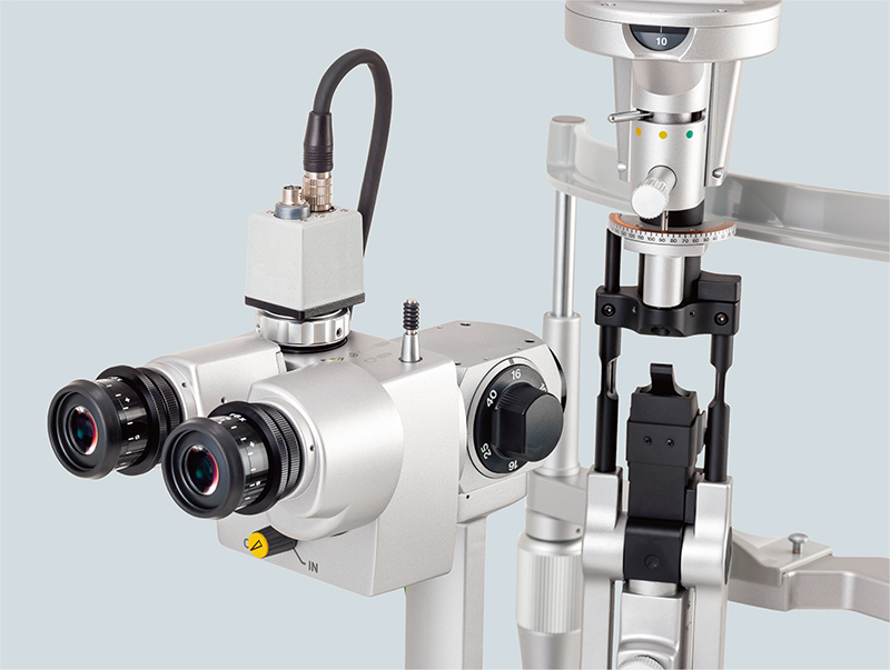 ビームスプリッター、 カメラアダプター、イエローフィルターをコンパクトなボディーに内蔵し一体化。接眼レンズから被検者までの距離を最小限におさえました。複数のアダプターを取り付けることによる操作性の悪さを解消しました。