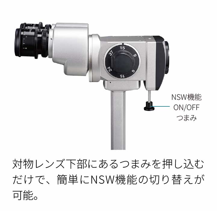 700GLの視路角は10°に設定されており比較的眼底が診やすいスリットランプですが、NSW機能をONにした700GL NSWでは視路角が4.1°となり、700GLよりも約133%広い立体視領域が得られ、より詳細な眼底観察が可能になります。眼底観察等を頻繁に行う特殊外来や眼底カメラを常設していない場合の眼底検査用装置としてご活用いただけるスリットランプです。