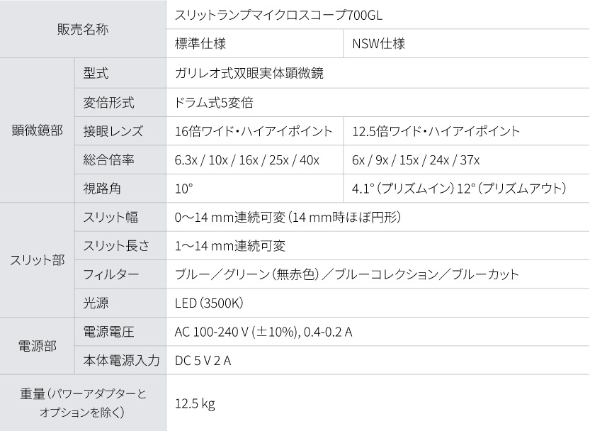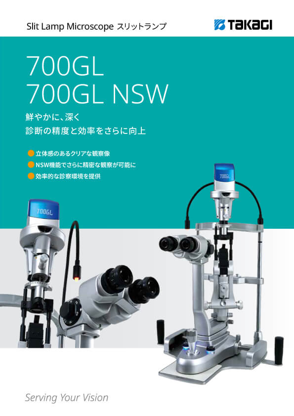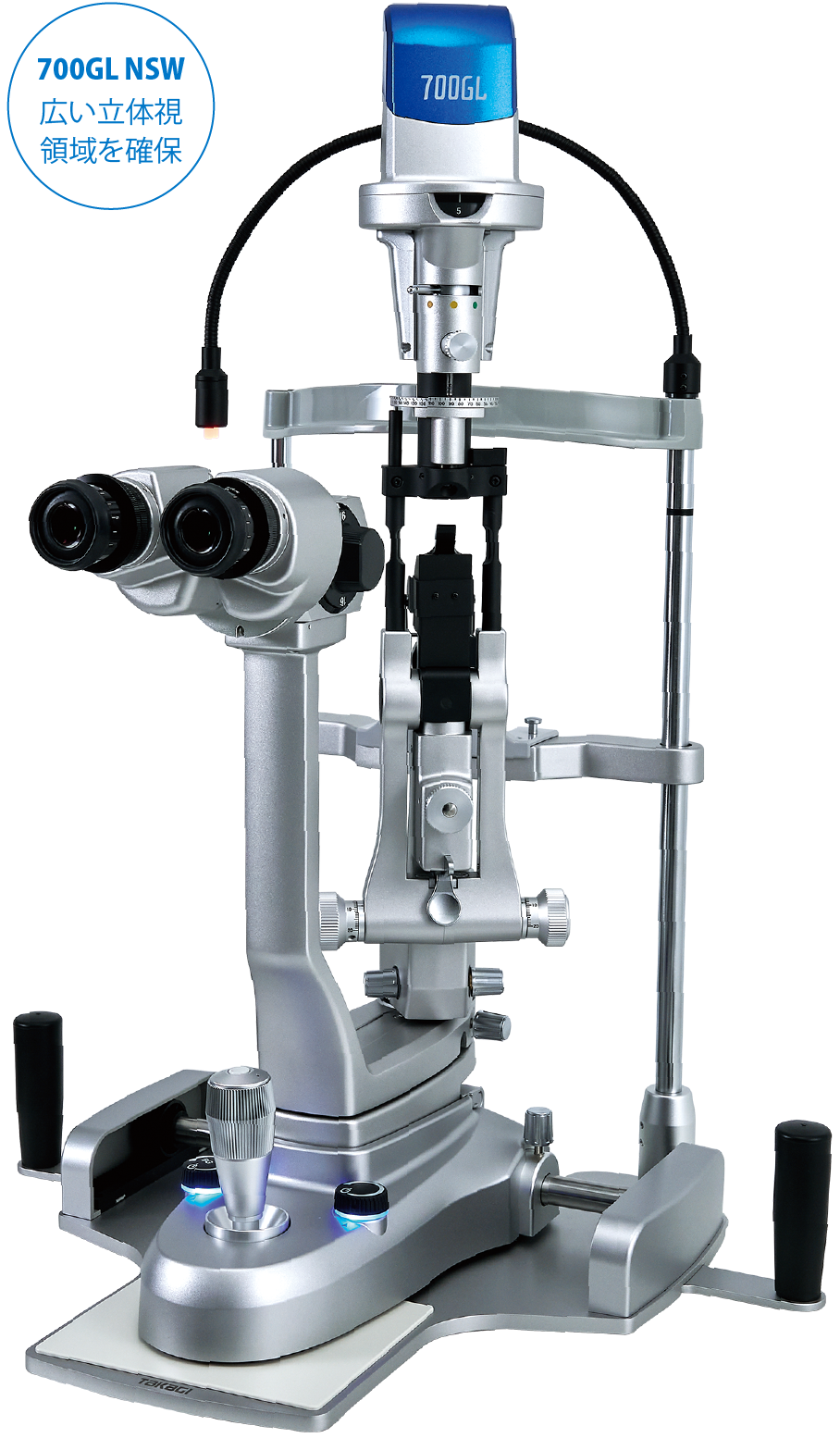 前眼部から眼底までの明瞭な観察を可能にするためにLED光源とのバランスを最適化したプレミアム光学系の700GLは、光と色のムラを抑えたシャープで鮮明なスリット光を提供します。光学設計の粋を結集し人間工学を融合させることで、ケーブル内蔵(特許取得)の美しいフォルムと使いやすさの両立を実現しました。より詳細な眼底観察ができる、NSW(広角眼底観察装置)モデルもご用意しています。