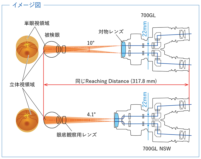 700GLの視路角10°に対し、NSWはこれを4.1°に変更することで、より広い立体視領域を確保。眼底を詳細に観察しやすくなり、精度の高い診断を行うことができます。