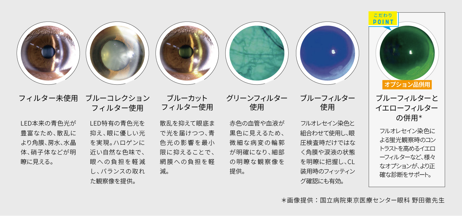 前眼部を広く均一に照らすためのディフューザーを標準装備しています。観察条件に応じてバックグラウンド照明とディフューザーを使い分けることで、撮影環境を柔軟に整えることができます。特に、フィルターを使用する場合は、ディフューザーによる光の拡散が有効です。これにより、観察方法に応じた照明の選択が可能となります。