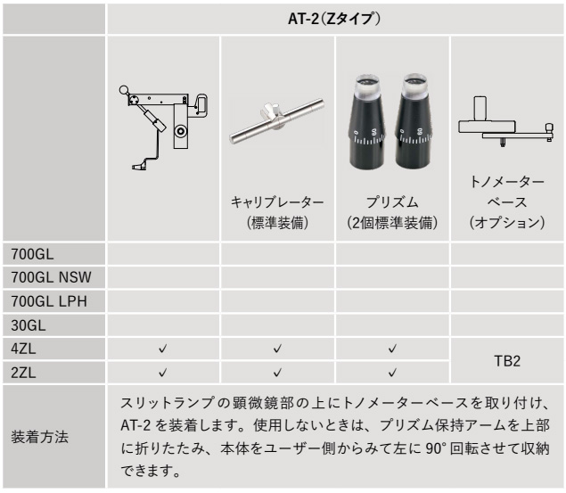 TAKAGI製スリットランプ用に設計されたAT-1(Rタイプ)/AT-2(Zタイプ)は、ゴールドマン圧平眼圧測定法に基づいており、緑内障、高眼圧症、網膜剥離などの診断に必要となる眼圧(IOP)測定を迅速、安全、正確に行えます。